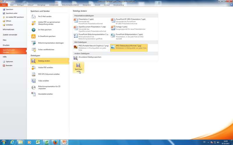 Screen-Präsentation (*.ppsx), 97-2003-Format (*.ppt), Bildformate (*.jpg oder *.png für alle Folien), Video-Export (*.wmv) und natürlich PDF mit Bordmitteln der Office-Familie ab 2007