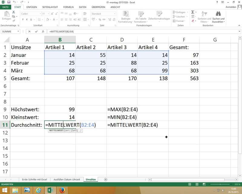 am Beispiel SUMME(); Eingabe mittels Maus und/oder Tastatur