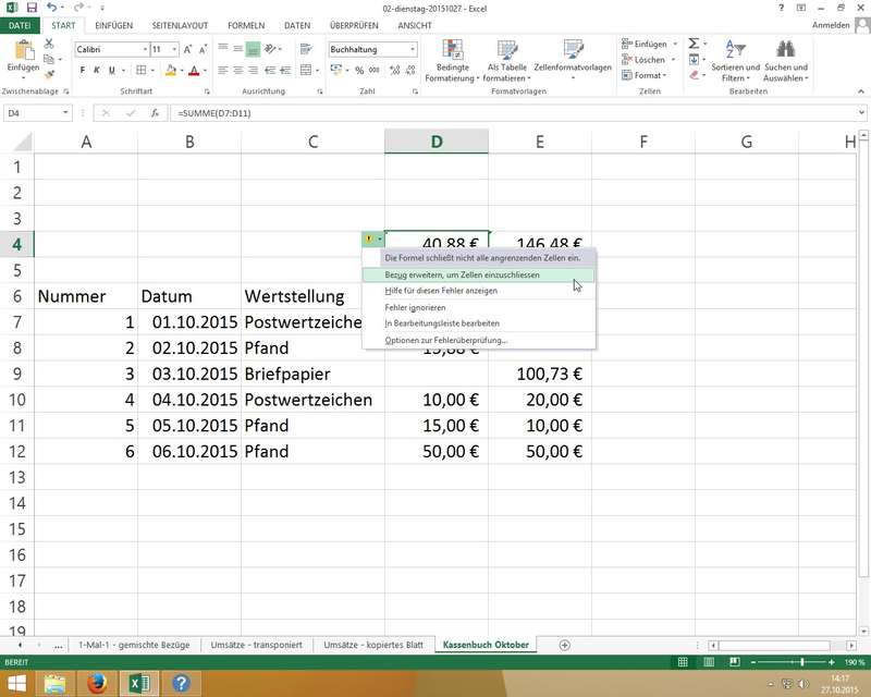 Tipp: mittels Transponieren kann man eine Tabelle "drehen/wenden" - also Spalten und Zeilen getauscht - Übung "Kassenbuch"