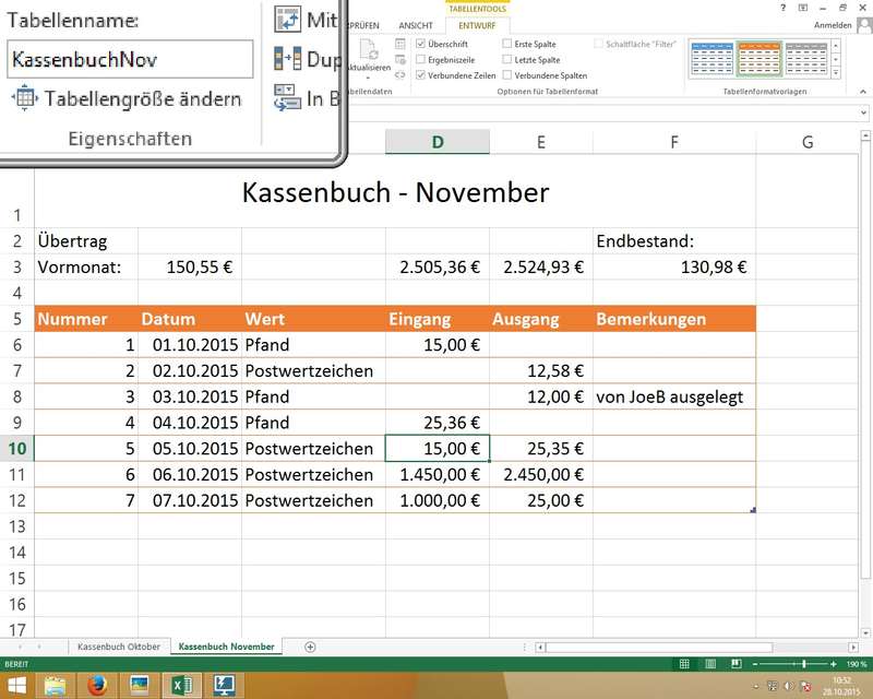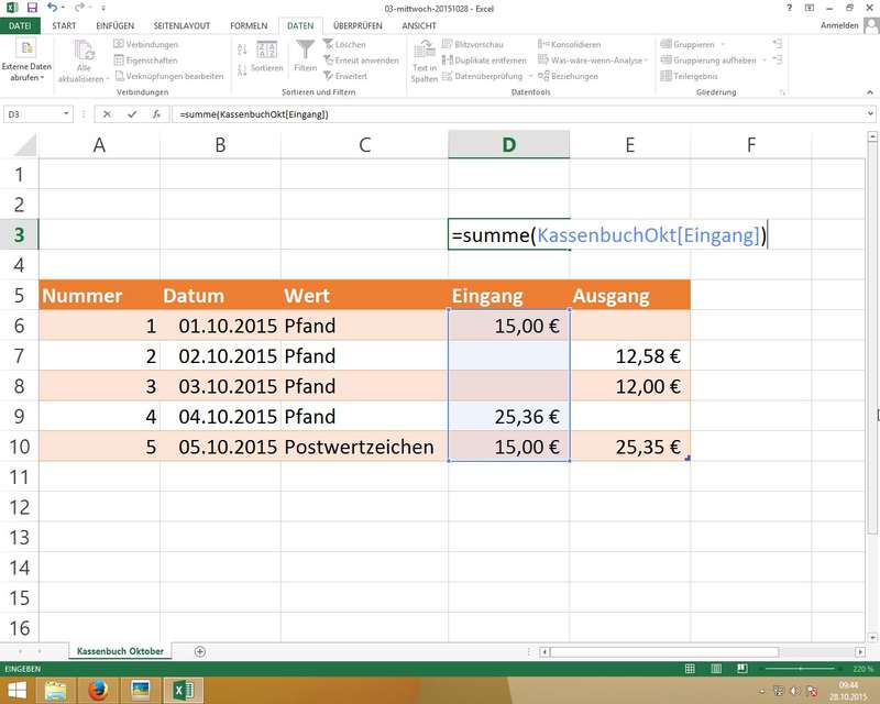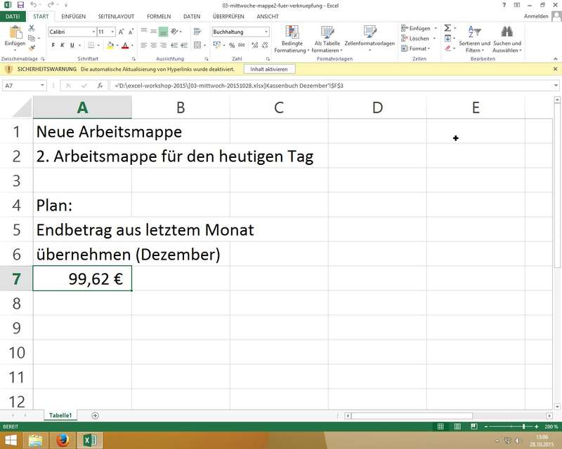 Wichtig: Excel merkt sich absolute Pfade (z.B. '[03-mittwoch-20151028.xlsx]Kassenbuch Dezember'!$F$3) - man darf also die Position in den Ordnern (Pfad) und den Dateinamen der verknüpften Mappe nicht ändern! - WENN-Funktion