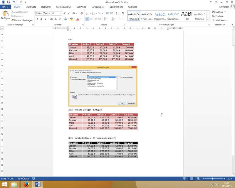 Excel Tabellen-Bereiche über die Zwischenablage in Word einfügen (als Übungsszenario)