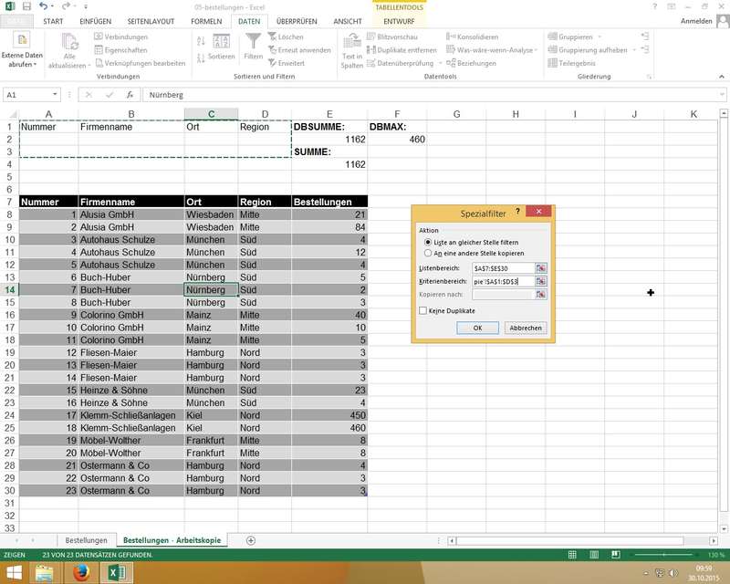 Zusammenhang mit DB-Funktionen (DBSUMME, DBANZAHL); auch hier wieder Einsatz von "Als Tabelle formatieren..."