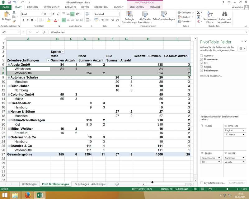 Gruppierte Bereiche (in Zeilen und/oder Spalten) möglich: zusätzlich Zeilen für "Firmenname" mit Feld "Ort" erweitert - also als 2. Zuordnung bei den "Zeilenbeschriftungen" hinzugefügt