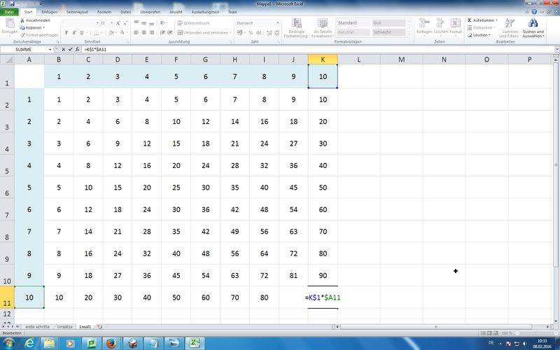 Übung: gemischte relative/absolute Zellbezüge bei "kleinem 1-Mal-1" (Formel: =B$1 * $A2 ) - Diagramme - Diagrammblatt auf Knopfdruck