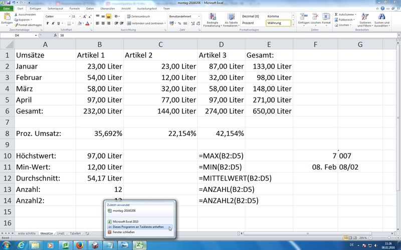 MIN(), MAX(), MITTELWERT(), ANZAHL, ANZAHL2, HEUTE()