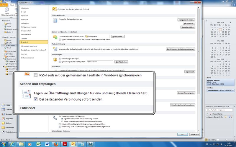 diverse Einstellungen in den verschiedenen Hauptkategorien der Optionen durchgegangen; hier beispielhaft aufgeführt: Oberfläche ändern (Farben, Live-Vorschau), E-Mail-Formate (HTML, Rich-Text, Nur-Text), Sendeverhalten (nicht sofort Senden, Konten konfigurieren, F9), Einstellungen zu Kalender und Kontakten, Einblenden des Journals (Protokoll zu E-Mail und Co), ... - TN-Bescheinigungen, letzte Fragen