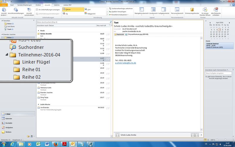 Im Rahmen der EDV-Mitarbeiterfortbildungen der TU Braunschweig findet am 07.04.2016 am Gauß-IT-Zentrum in der Hans-Sommer-Straße 65 ein "Outlook 2010 - Seminar" statt.