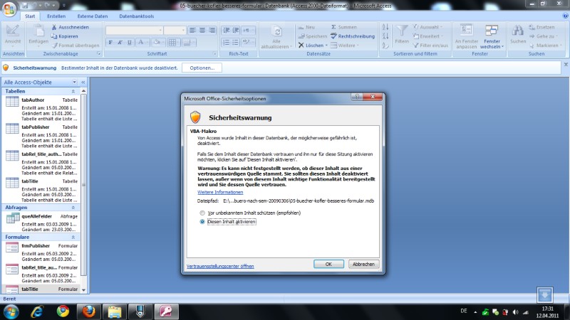 Wichtig: für das Hauptformular tabTitle in der DB muss beim Öffnen der DB das Aktivieren der "aktiven Inhalte" über die Schaltfläche "Optionen" durchgeführt werden, sonst bleiben die Schaltflächen stumm!