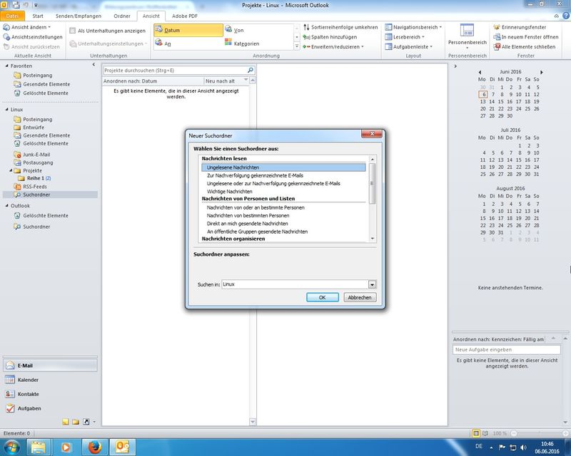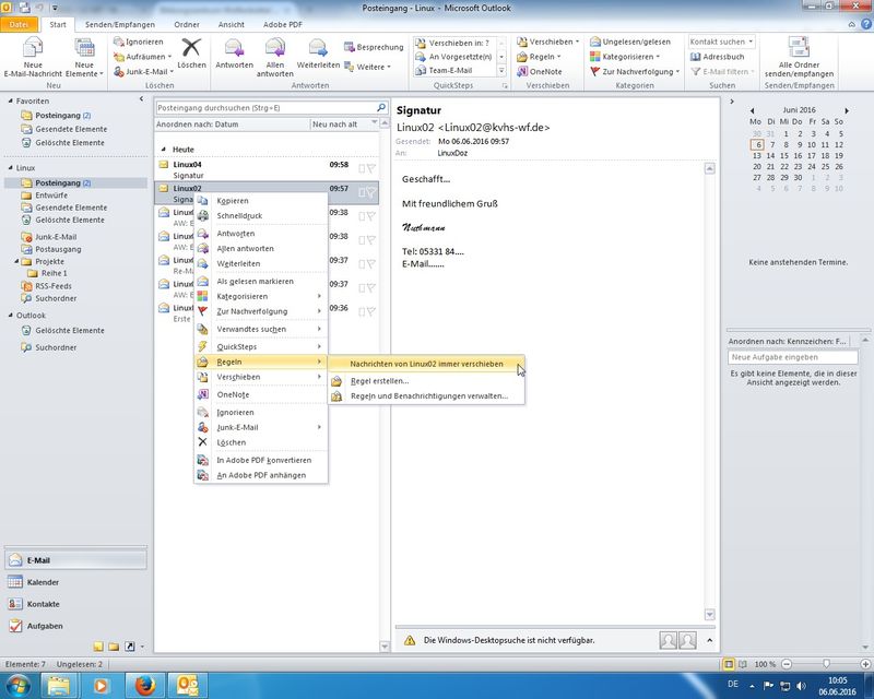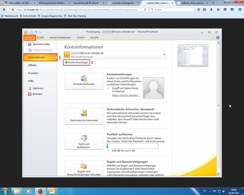 diverse Einstellungen in den verschiedenen Hauptkategorien der Optionen durchgegangen; hier beispielhaft aufgeführt: Oberfläche ändern (Farben, Live-Vorschau), E-Mail-Formate (HTML, Rich-Text, Nur-Text), Sendeverhalten (nicht sofort Senden, Konten konfigurieren), Einstellungen zu Kalender und Kontakten, Einblenden des Journals (Protokoll zu E-Mail und Co), ... - Vorlagen (für Mails)