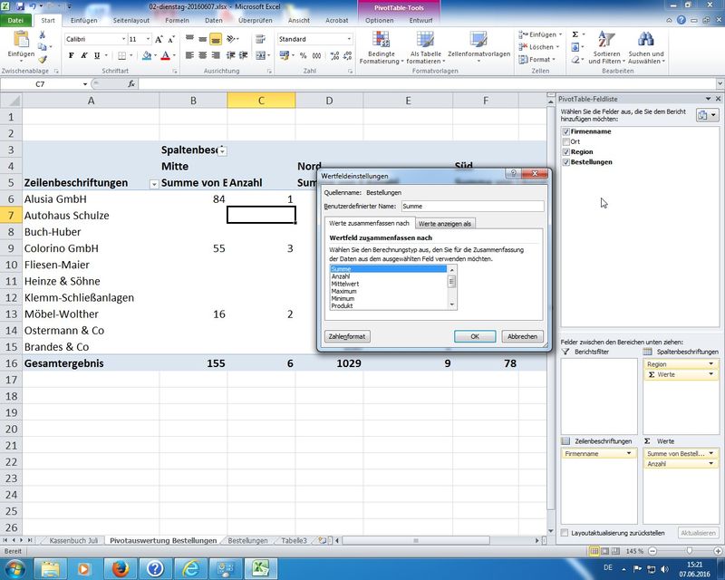 Arbeiten mit Formeln und Funktionen, Verknüpfungen, Formaten; Diagramme, Zählen von Werten bestimmten Typs in einer Spalte,