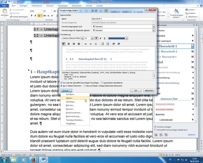 Anspassen der Formatvorlagen mittels Fenster Formatvorlagen - Vorlage - Ändern