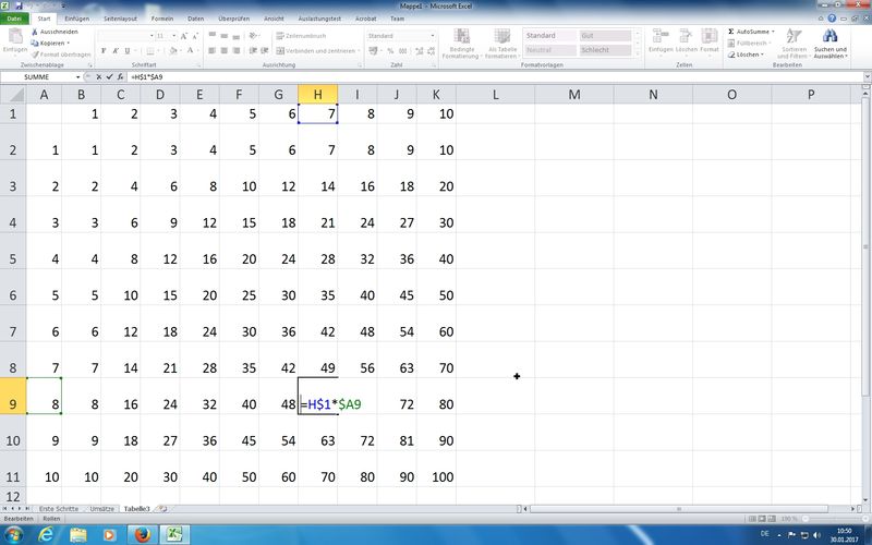 Übung gemischte Bezüge: gemischte relative/absolute Zellbezüge bei "kleinem 1-Mal-1" (Formel: =B$1 * $A2 ) - Funktionen