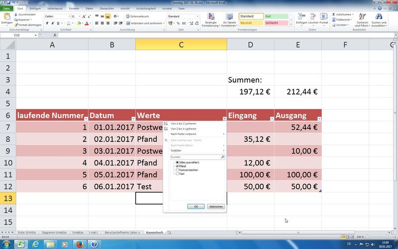 Wichtige Erkenntnis: beim Filtern von Daten werden zwar in Tabellen die nicht zutreffenden "Datensätze" ausgeblendet, aber eine Summe über eine Datenspalte berechnet weiterhin die Gesamtsumme (also ohne Filter!)