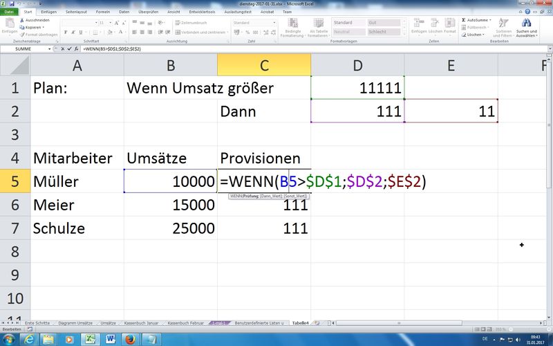 Nutzung von Zellen für Vergleichswerte in Prüfungen und für Berechnungen in den Dann/Sonst-Zweigen verlangen wieder nach den absoluten Zellbezügen, damit sich die Funktionen auch sauber kopieren lassen (nach unten ziehen lassen) - SVERWEIS Funktion