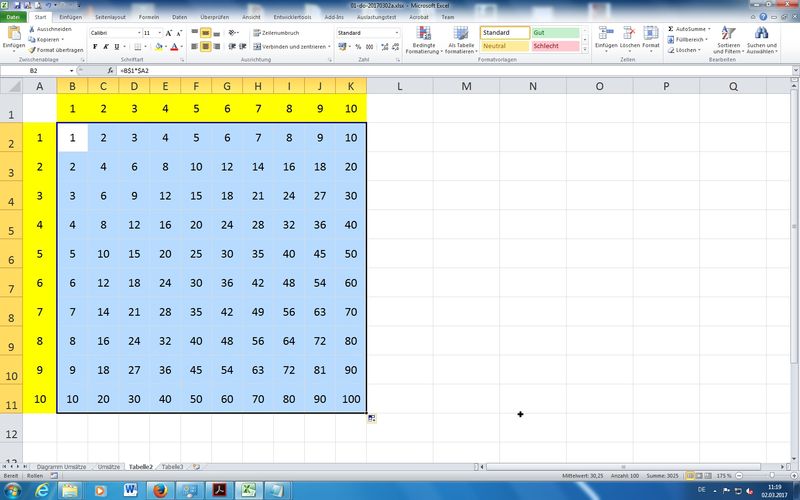 Übung: gemischte relative/absolute Zellbezüge bei "kleinem 1-Mal-1" (Formel:=B$1 * $A2) - Diagramme - Diagrammblatt auf Knopfdruck