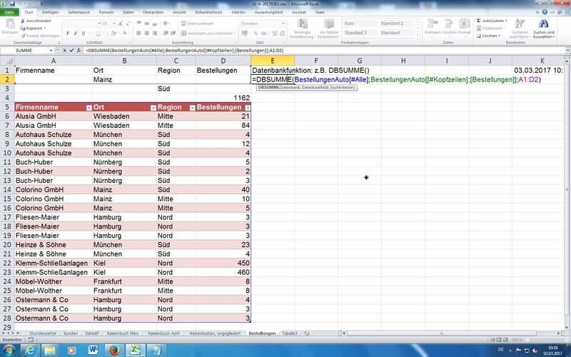 Zusammenhang mit DB-Funktionen (DBSUMME, DBANZAHL); auch hier wieder Einsatz von "Als Tabelle formatieren..."