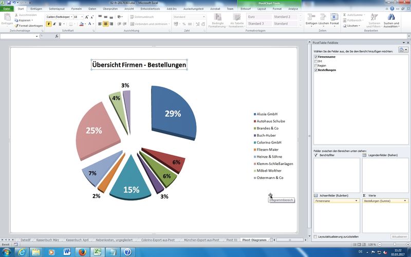 Gruppierte Bereiche (in Zeilen und/oder Spalten) möglich: zusätzlich Zeilen für "Firmenname" mit Feld "Ort" erweitert - also als 2. Zuordnung bei den "Zeilenbeschriftungen" hinzugefügt