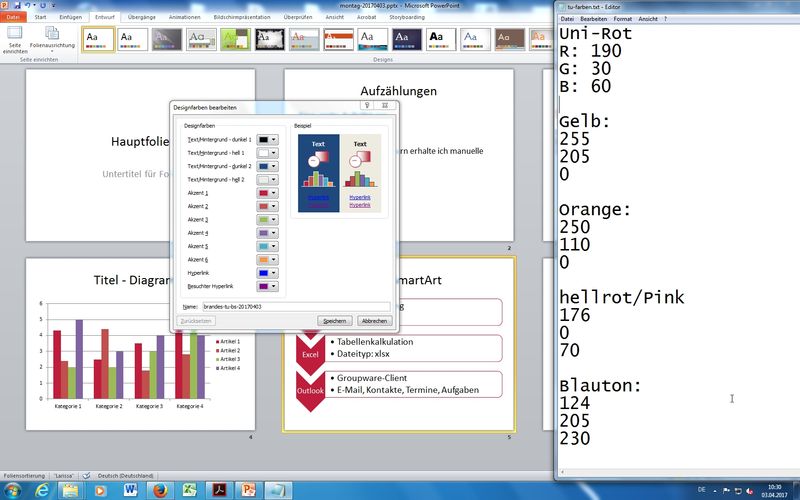 Farben landen im Templates-Unterordner - Document Themes - Theme Colors als XML-Dateien:C:\Users\joebr_000\AppData\Roaming\Microsoft\Templates\Document Themes\Theme Colors\TUBS.xml - Designentwurf