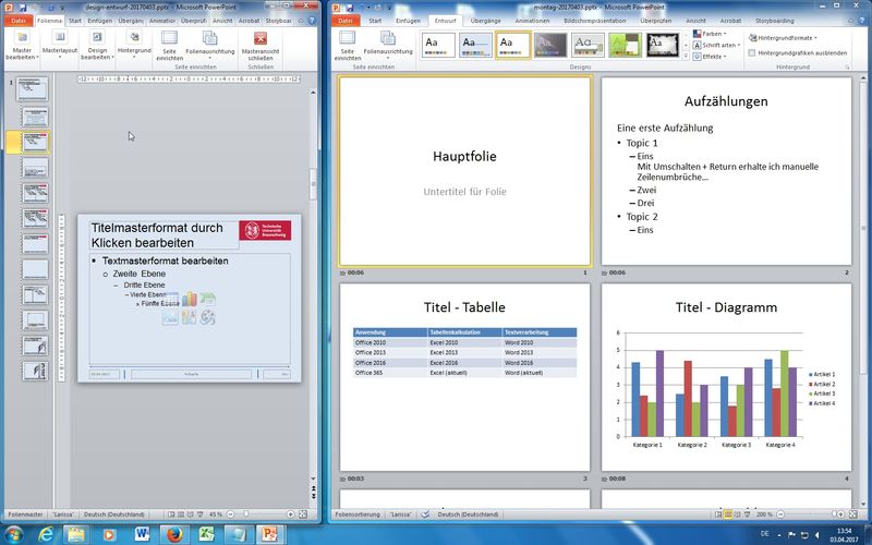 Im Rahmen der Fortbildungen an der TU Braunschweig findet am 03.04.2017 ein "PowerPoint Seminar" statt. Wir werden uns intensiv und praxisnah mit den Feinheiten des Präsentationsspezialisten beschäftigen. Das Seminar findet in den IT-Schulungsräumen der TU BS im Gauß-IT-Zentrum in der Hans-Sommer-Str. 65 statt.