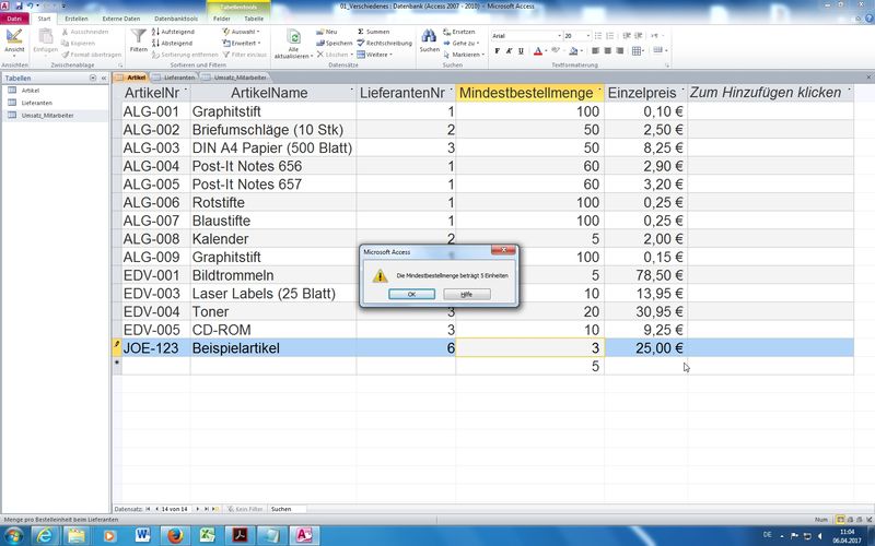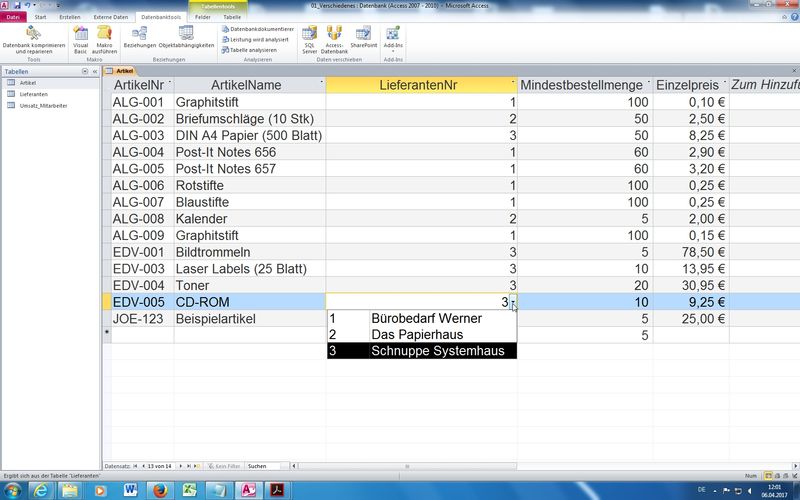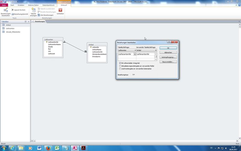 hier: Referentielle Integrität (1 - ∞) verhindert Datensätze mit nicht passenden Einträgen - Beispiel: keine LieferantenNr 6 in Tabelle Artikel mehr möglich, da diese noch nicht als LieferantenNr in Tabelle Lieferanten vorliegt!
