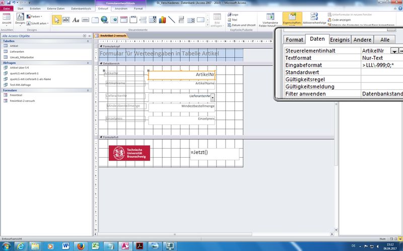 manuelle Erstellung in Entwurfsansicht, Formularbereiche (Kopf, Fuß, Detailbereich), Datensatzmarkierer und Navigationen ein-/ausschalten, - Textfeld vs. Bezeichnungsfeld