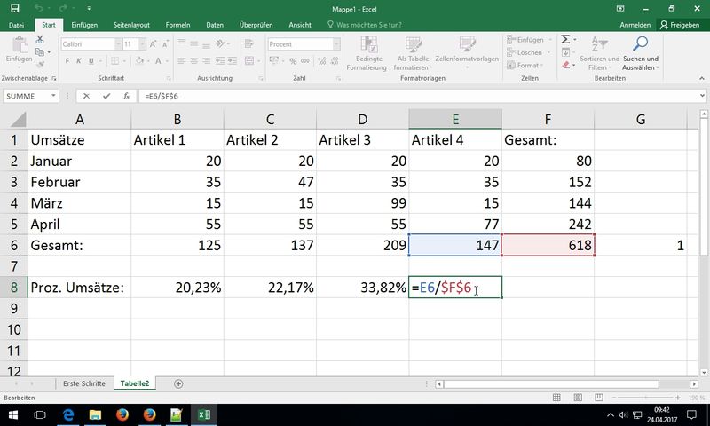 Tipp: mit Cursor an Zellbezug und Druck auf F4 automatische $ - Übung mit Prozentualem Umsatz