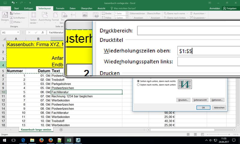 Anm.: Wiederholungszeilen lassen sich nur in der Tabellenbearbeitung über Ribbon Seitenlayout - Seite einrichten konfigurieren; Tipp: Direkt über Symbol "Drucktitel einstellen" - WENN-Funktion