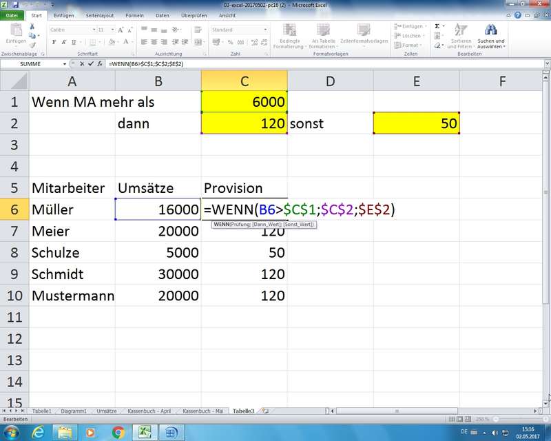 Nutzung von Zellen für Vergleichswerte in Prüfungen und für Berechnungen in den Dann/Sonst-Zweigen verlangen wieder nach den absoluten Zellbezügen, damit sich die Funktionen auch sauber kopieren lassen (nach unten ziehen lassen) - Tabellenblätter "absichern" (Blattschutz)