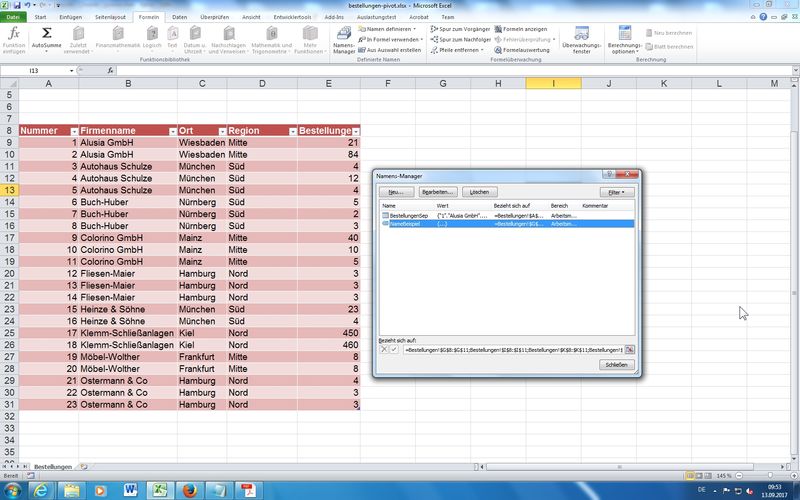 Hinweis: beim Ändern der Datenbereiche für die PivotTable muss man diese manuell aktualisieren
