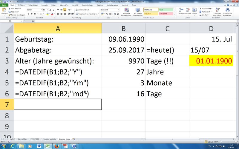 falls/wenn diese größer ist als 6:00 Stunden (6/24 Tag!) dann eine halbe Stunde (1/48 Tag) abziehen, sonst die Arbeitszeit selbst übernehmen - DATEDIF (Beispiel für versteckte Funktionen in Excel)