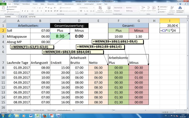 Anm.: negative Zellen (Zahlen kleiner 0) lassen sich nicht in Uhrzeit-Format darstellen -> Einsatz von WENN-Funktion