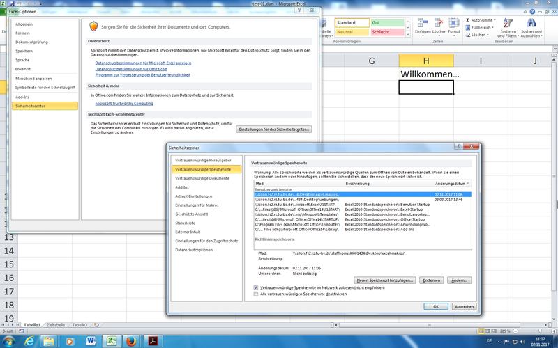 Hier: Einstellungen für Makros (möglichst unverändert lassen); Vertrauenswürdige Speicherorte