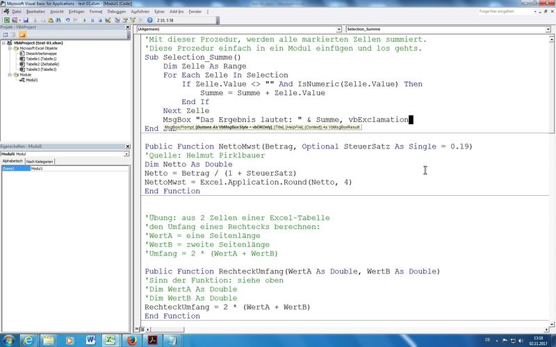 Auszüge aus Übungen: (ein Makro und eine Funktion){code lang:freebasic showtitle:false lines:true hidden:false}'Mit dieser Prozedur, werden alle markierten Zellen summiert.