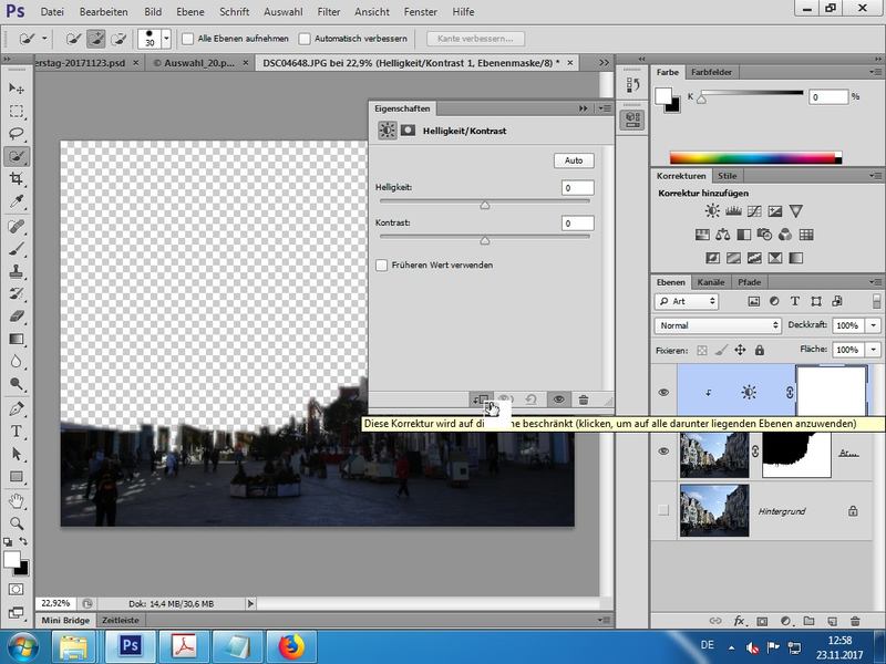 mit einfacher Korrekturebene "Helligkeit & Kontrast" - bei Korrekturebenen gibt es extra ein Icon für Schnittebene
