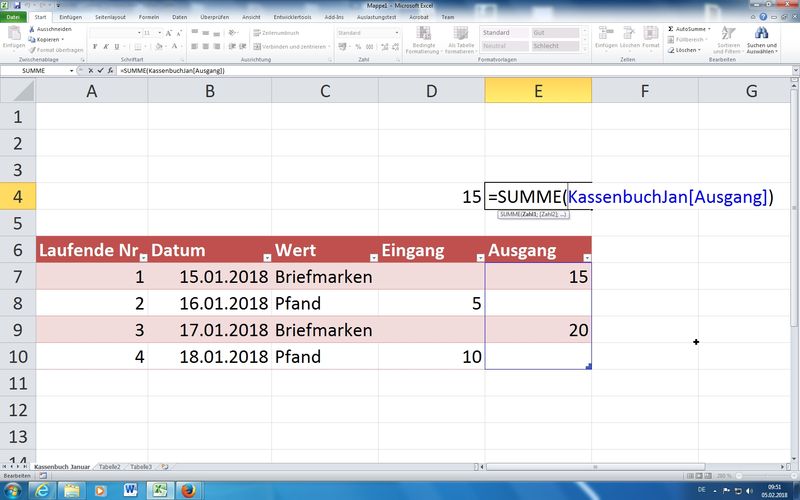 außerdem lassen sich diese Tabellenbereiche sinnvoll benennen und damit "sprechende" Formeln erzeugen:=SUMME(KassenbuchSep[Eingang])