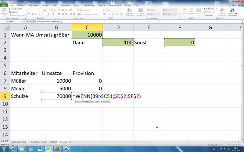 Nutzung von Zellen für Vergleichswerte in Prüfungen und für Berechnungen in den Dann/Sonst-Zweigen verlangen wieder nach den absoluten Zellbezügen, damit sich die Funktionen auch sauber kopieren lassen (nach unten ziehen lassen) - SVERWEIS Funktion