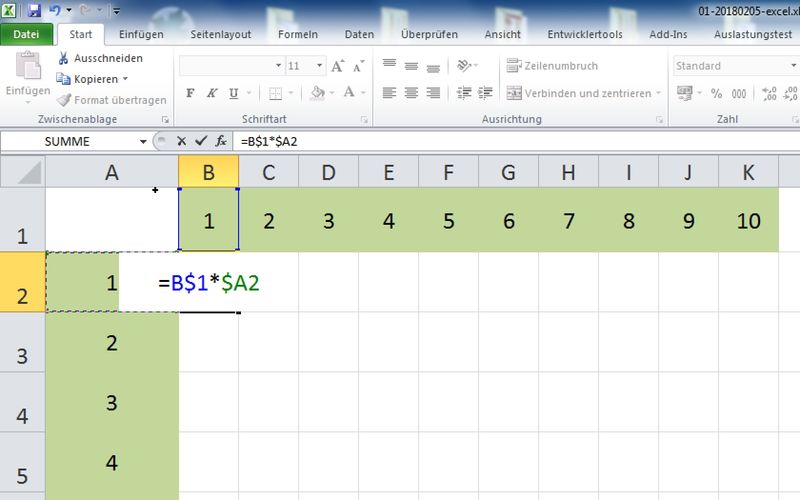 Übung: gemischte relative/absolute Zellbezüge bei "kleinem 1-Mal-1" (Formel:=B$1 * $A2) - Diagramme - Diagrammblatt auf Knopfdruck