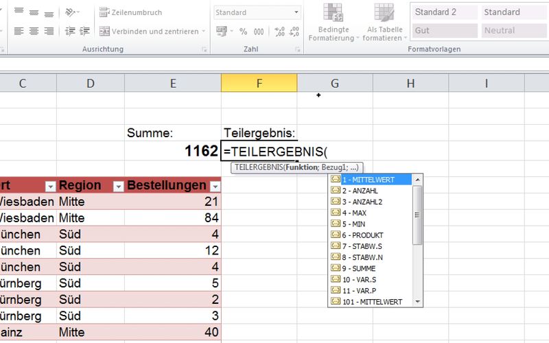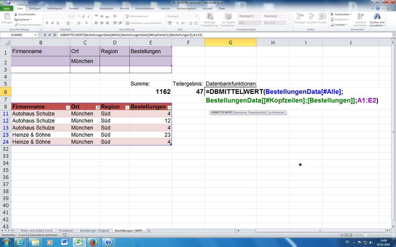 Zusammenhang mit DB-Funktionen (DBSUMME, DBANZAHL); auch hier wieder Einsatz von "Als Tabelle formatieren..."