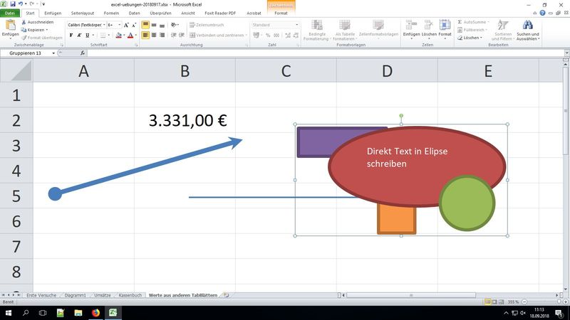 Praxis mit Zellen, Zellbereichen und Tabellenblättern - auch mit mehreren Arbeitsmappen! (Tipp: Menüband Ansicht - Alles Anzeigen - z.B. vertikal)