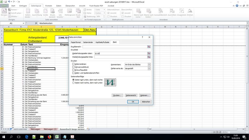 Anm.: Wiederholungszeilen lassen sich nur in der Tabellenbearbeitung über Ribbon Seitenlayout - Seite einrichten konfigurieren; Tipp: Direkt über Symbol "Drucktitel einstellen"