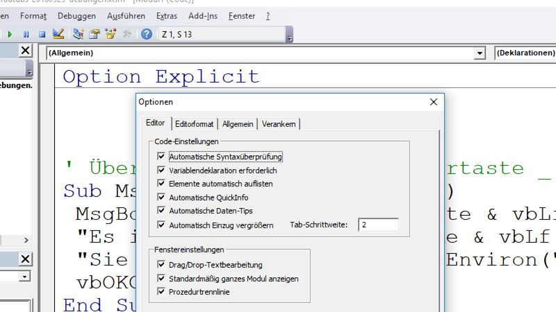 Einstellungen für Tab-Schrittweite (z.B. 2 statt 4 Leerzeichen) und automatische "Option Explicit" für neue Module