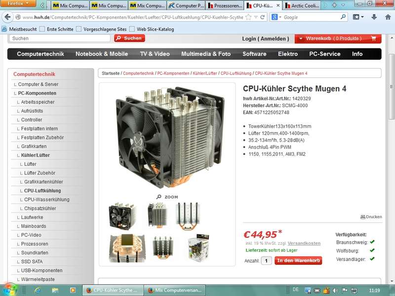 CPU: in Boxed-Versionen Standardkühlkörper/Lüfter der Hersteller Intel/AMD (funktionstüchtig aber "laut"), spezielle Kühlkörper von Spezialherstellern (z.B. Scythe, Alpenföhn, Arctic Cooling) für ca. 40 Euro)