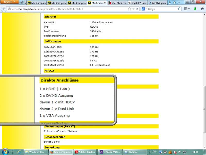 Ausgänge: VGA, DVI, HDMI, DP (analog und/oder digital, mit/ohne Sound)