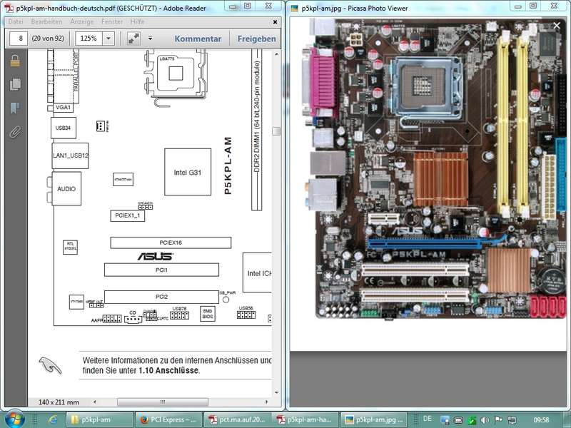 Steckplätze: lange und kurze Versionen, erste lange Version in Nachbarschaft CPU: x16-Platz für Grafikkarte (PEG - PCI Express Graphics), kurze Steckplätze x1 (1 Lane), Steckkarten für kurze Steckplätze auch in langen Steckplätzen einsetzbar, Unterschied zu PCI Steckplätzen auf Motherboards identifiziert - AMD Bastel-PC Neu