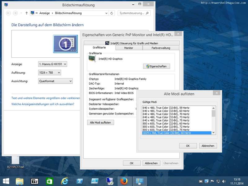 OS-seitige Konfigurationen von Auflösung + Farbtiefe + Bildwiederholrate (Hz)