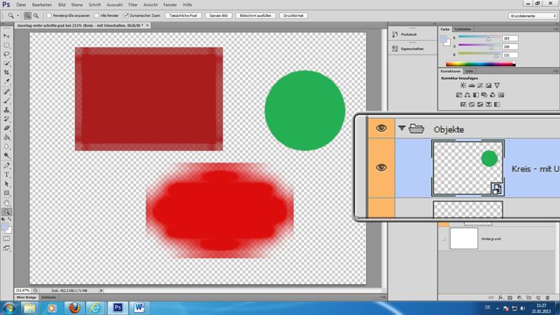 Füllung (also Formen) im Vergleich zu Pfaden; bei Formen auch "Pixel füllen" (siehe große Übung "Filmstreifen"); an Schnittmasken erinnert - Pfade