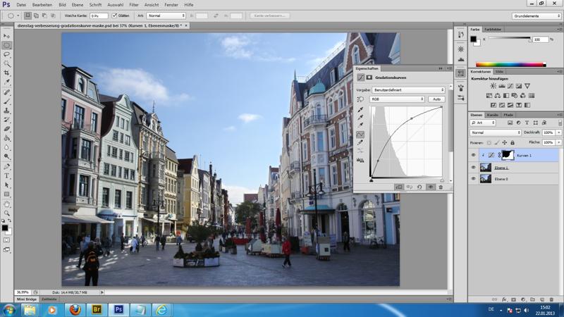 Beispiel für Farbkorrektur (Blaustich); Nutzung von ACV-Dateien zur Sicherung und zum Laden vordefinierter "Kurven"; die speziellen kleinen Menüschalter oben rechts in den jeweiligen Paletten (hier Gradationskuven) beachten - TIFF