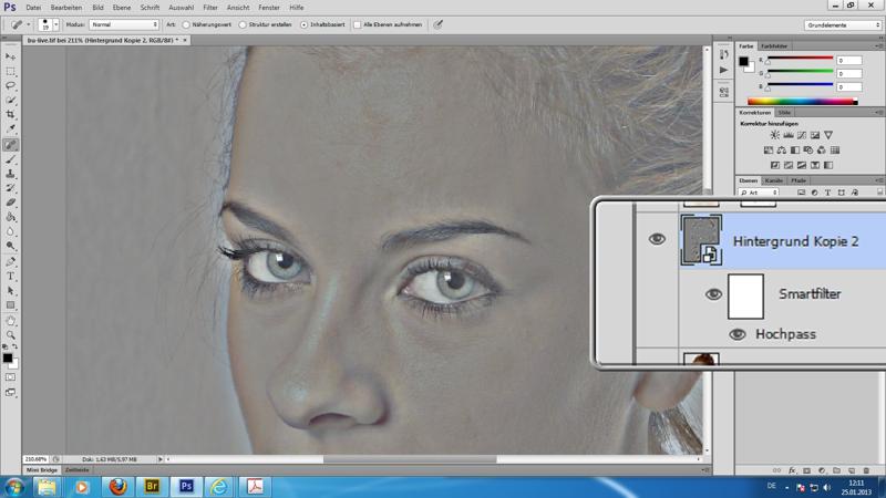 zwei beispielhafte "Hautglättungen" mit Hilfe von Gaußschem Weichzeichner und Hochpassfilterung in Kombination mit Smartfilter