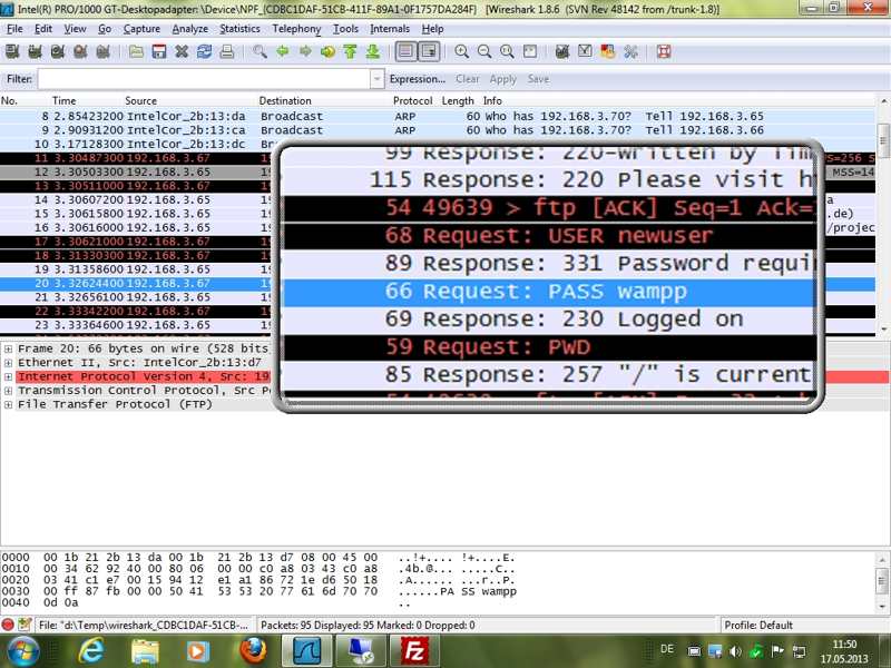 Speziell: Analyse mit Tool Wireshark (früher Ethereal) zum Nachweis, dass die Benutzerdaten (ohne Verschlüsselung) im Klartext durch das Netz gehen; Empfehlung: Secure FTP (eigentlich SSH - Secure Shell) - VPN (Virtual Private Network - Wiki Link)