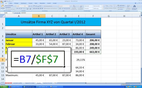 so lassen sich auch "Formeln" in Zellen eintragen - Zellbezüge (relativ und absolut)